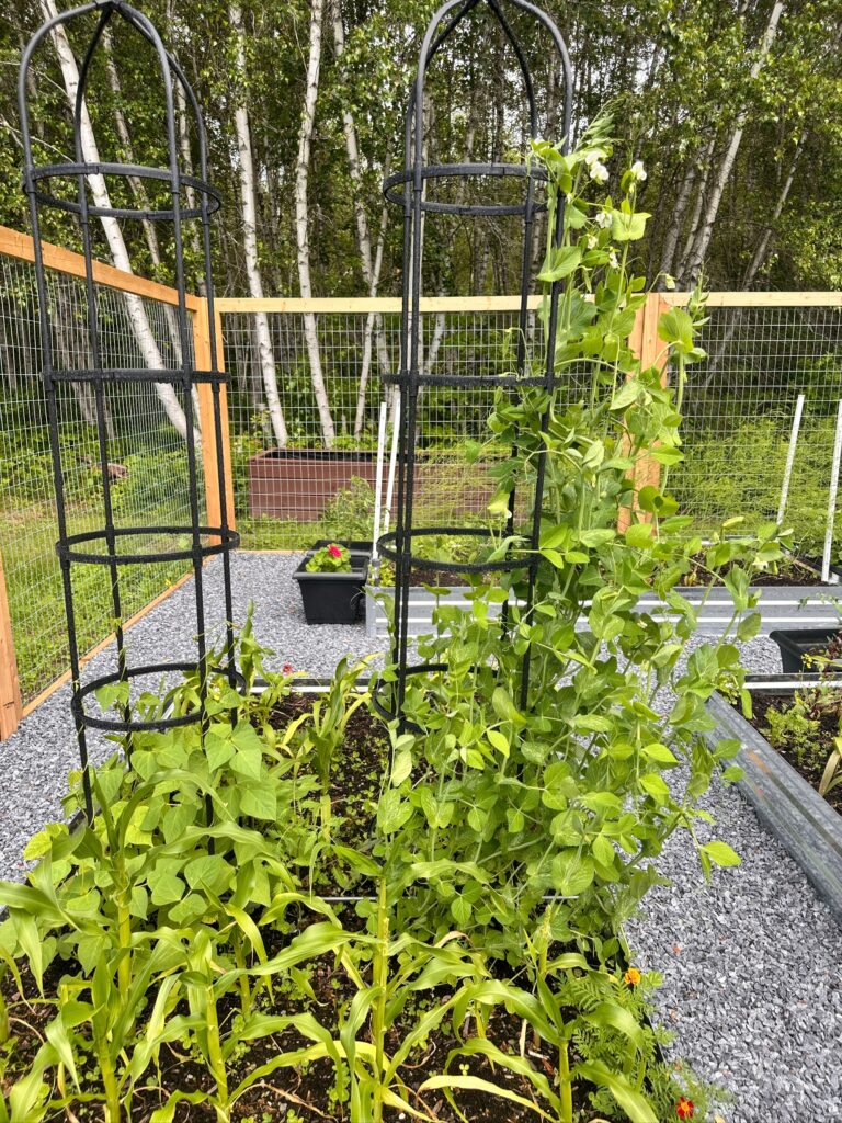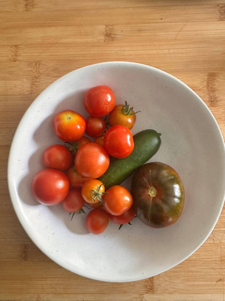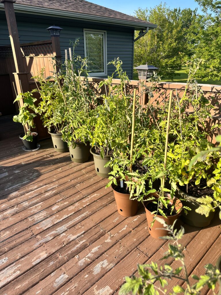 The tomatoes and cucumbers—babied started indoors have graduated to the deck and thriving in their sheltered, sun-warmed spot. There’s a noticeable difference in size between the deck dwellers and their wind-battered cousins in the main garden. Location, location, location!